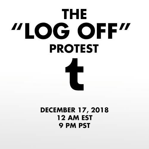 In response to the NSFW ban being enacted by Tumblr Staff, on December 17th 2018 I propose that we all log off of our Tumblr accounts for 24 hours.